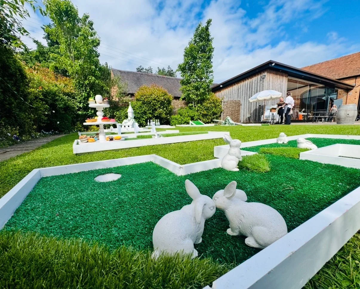 The courses are designed to work in as wide a variety of places as possible. Indoors, the interlocking astro grass mats that form the putting surface have a non-slip backing so that they can be used on wooden or tiled floors – and they will not leave marks or scratch the floor. Outdoors, any reasonably flat surface can be used, including grass, concrete and tarmac. The floor tiles are quick-drain (the bottom side is full of little holes) so that play can continue straight after a rain shower. No putting in puddles!